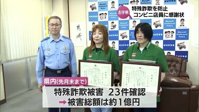 「30万円分の電子マネー購入?」特殊詐欺被害未然に防ぐ 都城市のコンビニ従業員に感謝状 2023年6月22日(木) 19:00 国内 特殊詐欺の被害を未然に防いだとして、都城市のコンビニエンスストアの店員に警察から感謝状が贈られました。都城警察署から感謝状が贈られたのは、セブン‐イレブン都城南横市店の従業員、柿木夏美さんと山田幸子…