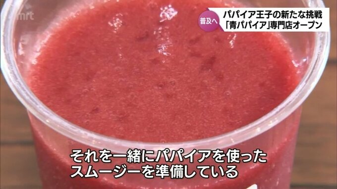 (パパイア王子こと岩本脩成さん)「きょうは新富町の農家が作っているとうもろこしとプラム、それを一緒にパパイアと使わせていただいたスムージーを準備している」