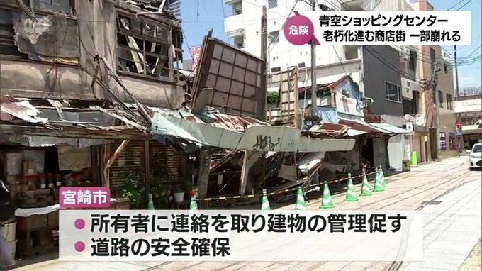 宮崎市では、所有者に連絡を取って建物の管理を促すとともに、道路の安全確保を行っていて、今後の対応を検討しているということです。