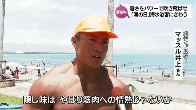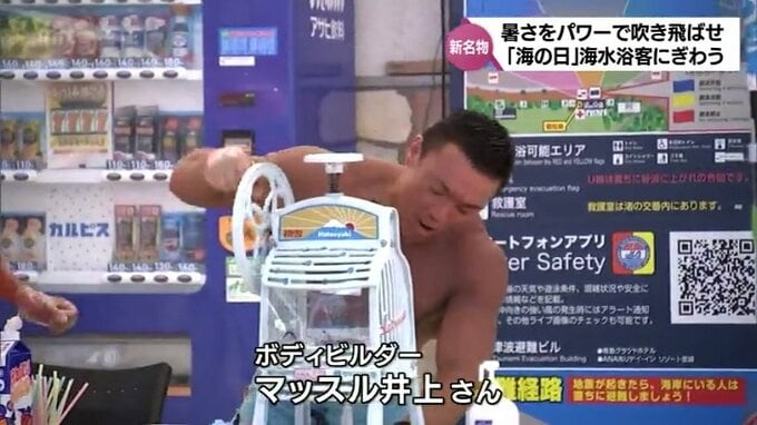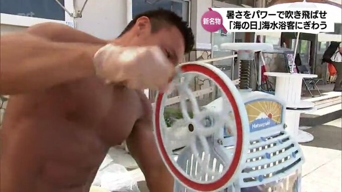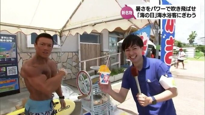 ライフガートとして海の安全を守っているボディビルダーのマッスル井上さんが、鍛え上げた筋肉で、かき氷を削っていました。