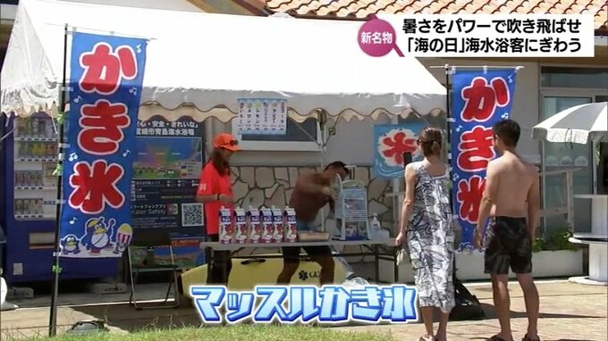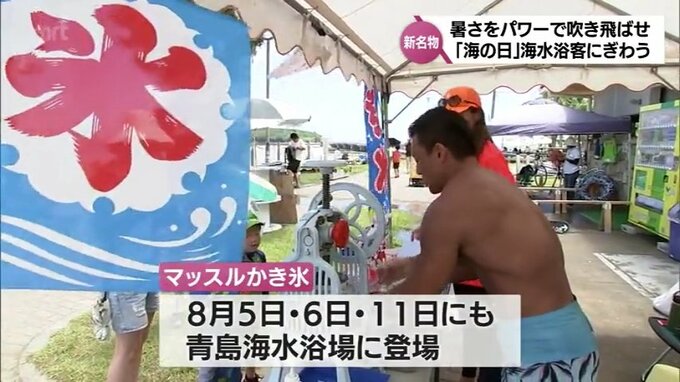 「マッスルかき氷」は、8月5日と6日、それに11日にも青島海水浴場に登場するということです。