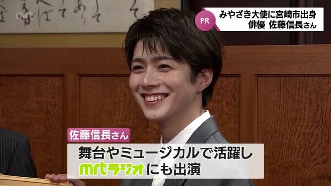舞台やミュージカル、MRTラジオでも活躍 俳優・佐藤信長さんが「みやざき大使」に 2023年7月28日(金) 19:00 国内 宮崎市出身で、舞台など幅広い分野で活躍する俳優の佐藤信長さんが「みやざき大使」に委嘱されました。28日は、県庁で委嘱式が行われ、俳優の佐藤信長さんに河野知事から委嘱状が手渡されました。佐藤さんは、ミュ…