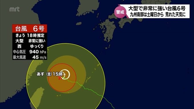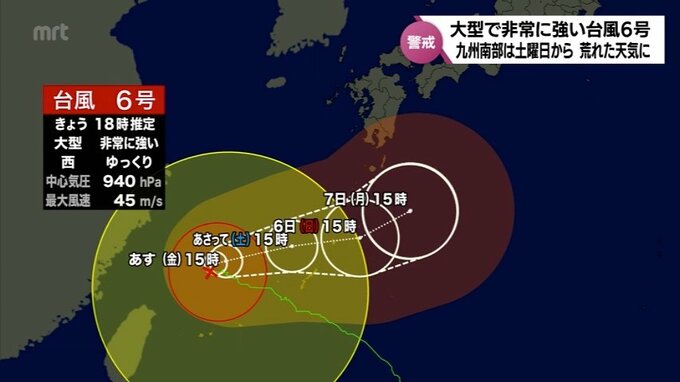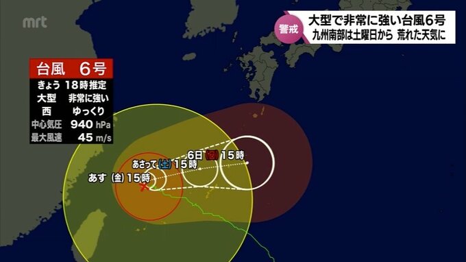 大型で非常に強い台風6号は、3日午後6時には宮古島の北北西の海上にあって、日曜にかけて、強い勢力を維持したまま東へ進み、奄美地方へかなり接近する見込みです。