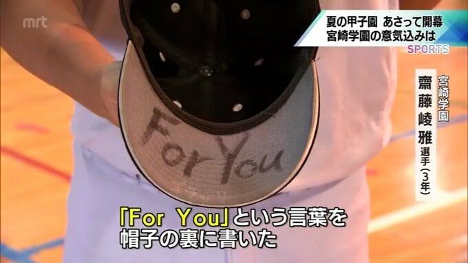 「誰かのためにプレーしなくてはいけないという気持ちになって、『FOR YOU』という言葉を帽子の裏に書いた。甲子園ではホームラン打てるように頑張る」