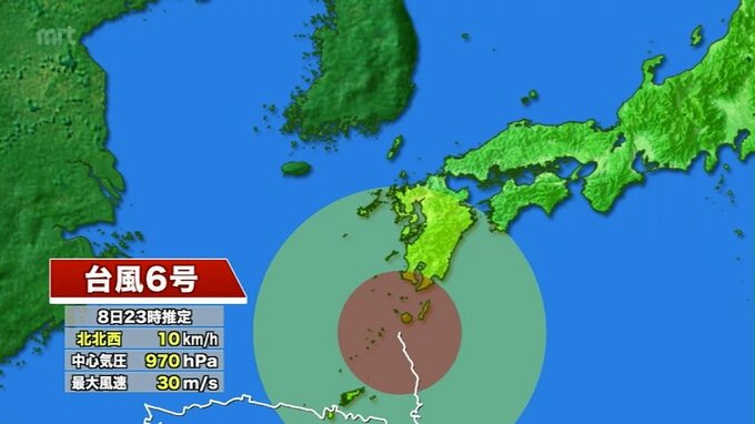 台風6号は、きょう午後11時には屋久島の南南西およそ40キロの海上にあって、1時間に10キロの速さで北北西へ進んでいるとみられます。