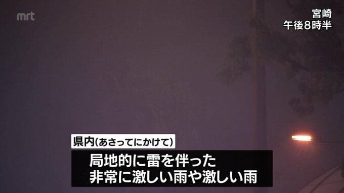 現在、宮崎県内は、全域が台風6号の強風域に入っていて、あさってにかけ局地的に雷を伴った非常に激しい雨が降るおそれがあり、土砂災害に厳重な警戒が必要です。