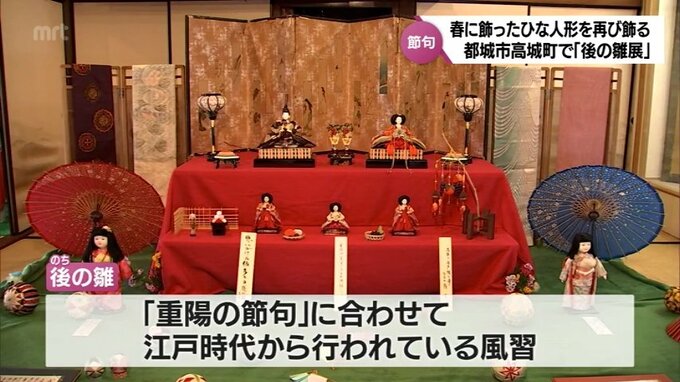 重陽の節句を前に 江戸時代から続く風習「後の雛展」 都城市高城町で18日まで 2023年9月5日(火) 19:00 国内 話題・グルメ 今月9日の「重陽の節句」を前に、宮崎県都城市高城町では、春に飾ったひな人形を再び飾る「後の雛展」が開催されています。都城市高城町の旧後藤家商家交流資料館で5日から始まった「後の雛展」。「後の雛」は「重…