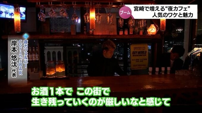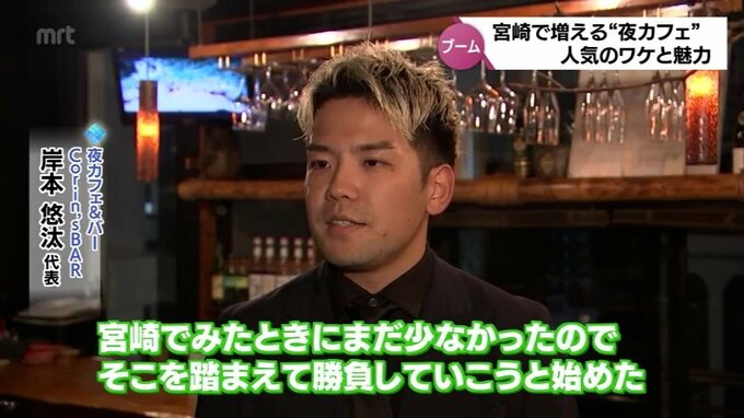「全国的に大打撃を受けた(新型)コロナウイルスの始まりですね、それがきっかけでお酒一本でこの街で生き残っていくのが厳しいなっていうふうに感じまして、全国的に需要が高まってきている夜カフェを宮崎ではまだまだ少なかったので、そこを踏まえて勝負していこうという感じで始めました」