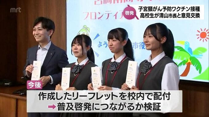 子宮頸がん予防ワクチン接種の普及啓発を目指して 宮崎市の高校生が市長と意見交換 2023年10月25日(水) 19:00 国内 若い女性が発症することが多い「子宮頸がん」について、宮崎市の高校生が予防ワクチン接種の普及啓発を目指して、清山市長と意見交換しました。宮崎市役所を訪れたのは、宮崎南高校2年の奥野はるなさんら生徒3人と…