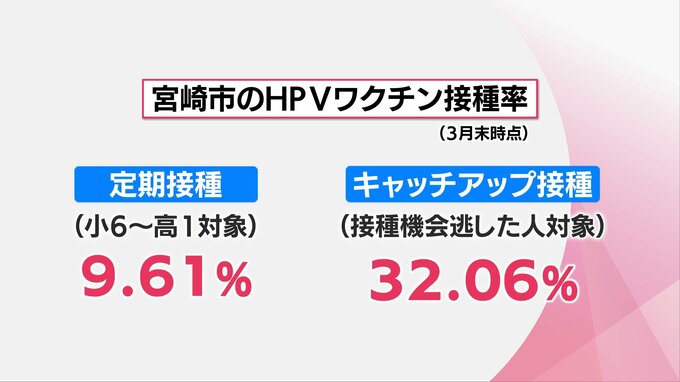 宮崎市によりますと、HPVワクチンの接種率は、今年3月末時点で、小学6年生から高校1年生までを対象とした定期接種が9・61%、接種の機会を逃した人を対象とするキャッチアップ接種が32・06%ということです。