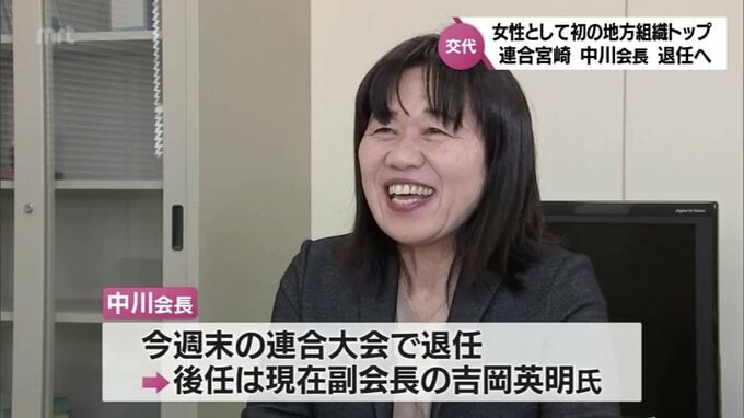 【独自】女性として初の地方組織トップ 連合宮崎 中川育江会長が退任へ 2023年10月25日(水) 19:00 国内 連合の地方組織で女性として初めてトップに立った連合宮崎の中川育江会長が、10月29日で退任することが関係者への取材で分かりました。県内の労働組合が加盟する連合宮崎で、2017年に会長に就任した中川育江氏。女…