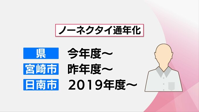 「ノーネクタイの通年化」を実施しているのは、日南市のほかに、今年度から県が、昨年度から宮崎市が実施しています。