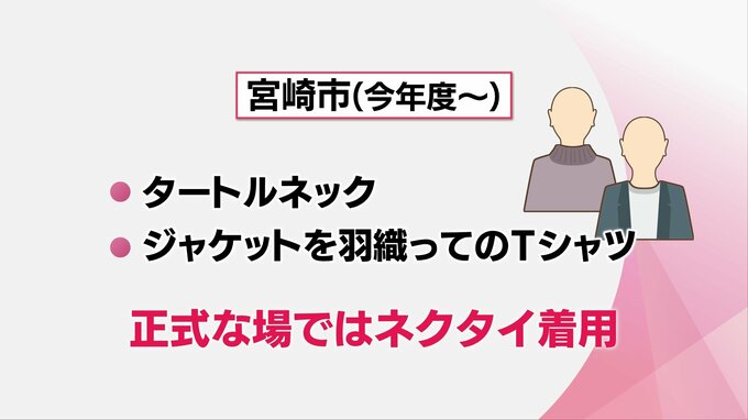 宮崎市は、今年度からタートルネックやジャケットを羽織ってのTシャツ着用などが可能となったということです。