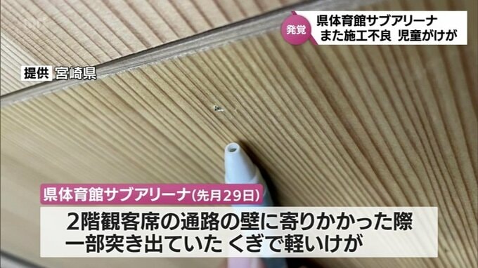 新・宮崎県体育館サブアリーナでまた施工不良が発覚 壁から突き出ていた釘で小学生が軽いけが 2023年11月14日(火) 19:00 国内 延岡市にある新しい宮崎県体育館のサブアリーナで、先月、小学生が壁から突き出ていたくぎでけがをしていたことが分かりました。県によりますと、先月29日、県体育館のサブアリーナに少年柔道大会の観戦に訪れてい…