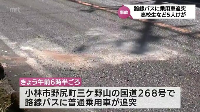 事故があったのは、小林市野尻町三ケ野山の国道268号で、22日午前6時半ごろ路線バスに普通乗用車が追突。