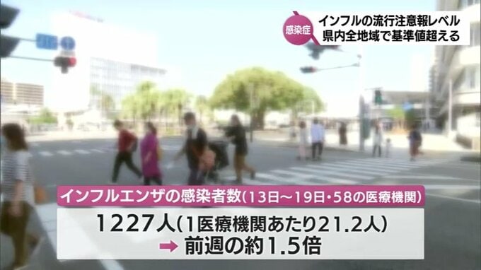 インフルエンザ 宮崎県内全域で「流行注意報レベル」に 感染者数は前週比1.5倍 「プール熱」も引き続き「流行警報レベル」 2023年11月22日(水) 19:00 国内 インフルエンザの感染者数が今シーズン初めて宮崎県内すべての地域で流行注意報レベルの基準値を超えました。今月19日までの1週間に、県内58の医療機関で確認されたインフルエンザの感染者数は1227人で、1医療機関…
