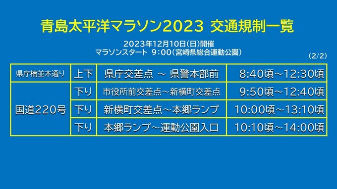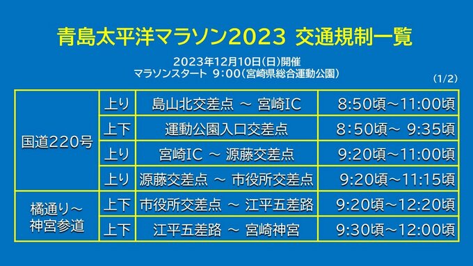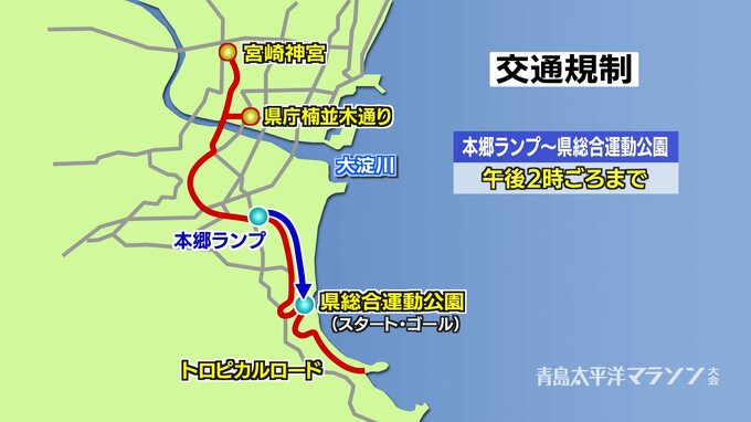 10日に宮崎市で開催される青島太平洋マラソンに伴い、コース周辺では交通規制が行われます。