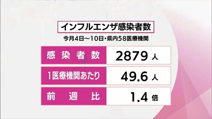 今月10日までの1週間に県内58の医療機関で確認されたインフルエンザの感染者数は、2879人で、1医療機関あたり49.6人と、前の週の1.4倍に増加。