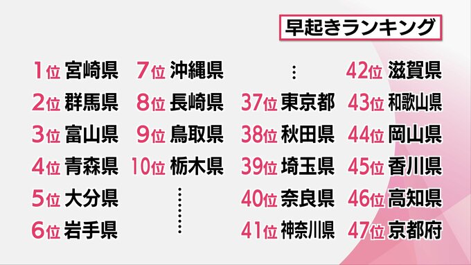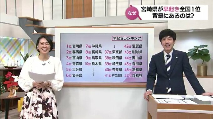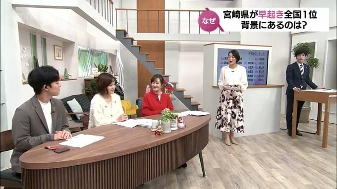 専門家の先生いわく、宮崎が日本一早起きである有力説として、「お子さんのいる家庭が多いうえ、労働環境として朝早く仕事場に行かないといけない人の割合が日本一なんじゃないか」ということでした。