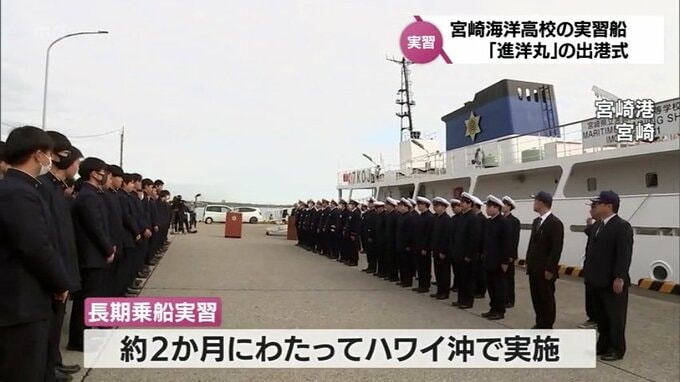 ハワイ沖で約2か月間高校生たちが乗船実習 宮崎海洋高校の「進洋丸」が出港 2024年1月18日(木) 19:00 国内 宮崎海洋高校の実習船「進洋丸」が、およそ2か月間にわたって行われる乗船実習のため、宮崎港を出港しました。宮崎海洋高校の長期乗船実習は、およそ2か月間にわたってハワイ沖で行われます。18日は、宮崎港で実習…