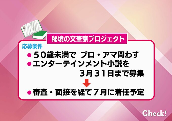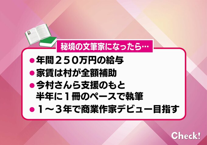 そして、「秘境の文筆家」に選ばれたら、年間250万円の給与が支払われるほか、家賃は村が全額補助されます。