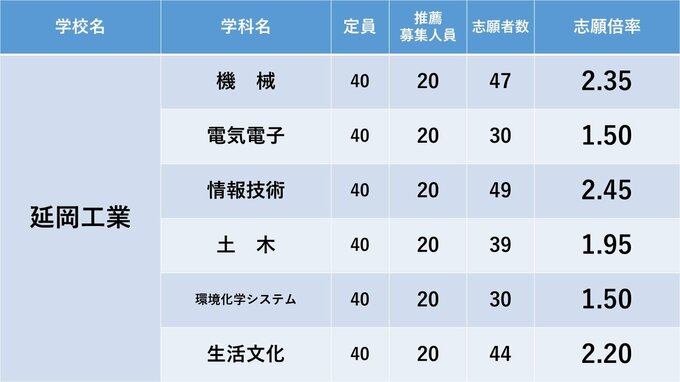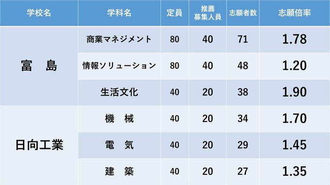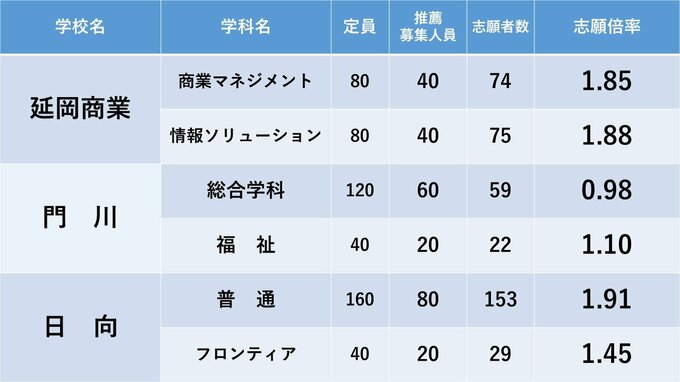 宮崎県立高校入試 2024年推薦入試(自己推薦方式)志願状況【全高校・学科】 全日制倍率「1.70倍」 2024年1月24日(水) 18:00 国内 暮らし・マネー 高千穂・延岡・延岡星雲・延岡工・延岡商・門川・日向・富島・日向工の志願倍率