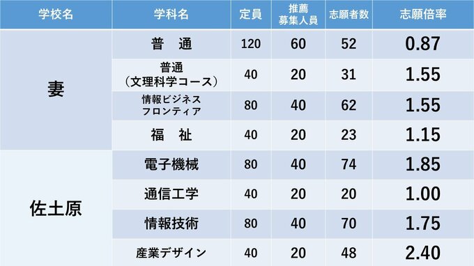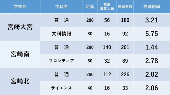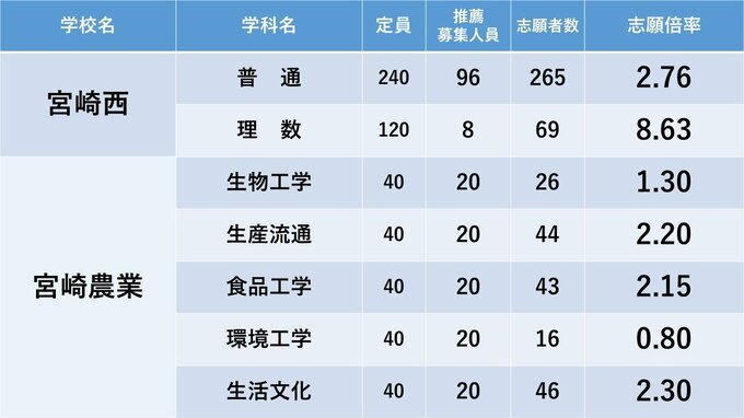 宮崎県立高校入試 2024年推薦入試(自己推薦方式)志願状況【全高校・学科】 全日制倍率「1.70倍」 2024年1月24日(水) 18:00 国内 暮らし・マネー 高鍋・高鍋農・妻・佐土原・宮崎大宮・宮崎南・宮崎北・宮崎西・宮崎農の志願倍率
