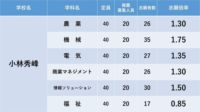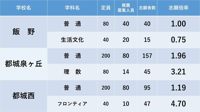 宮崎県立高校入試 2024年推薦入試(自己推薦方式)志願状況【全高校・学科】 全日制倍率「1.70倍」 2024年1月24日(水) 18:00 国内 暮らし・マネー 宮崎工・宮崎商・宮崎海洋・本庄・小林・小林秀峰・飯野・都城泉ヶ丘・都城西の志願倍率