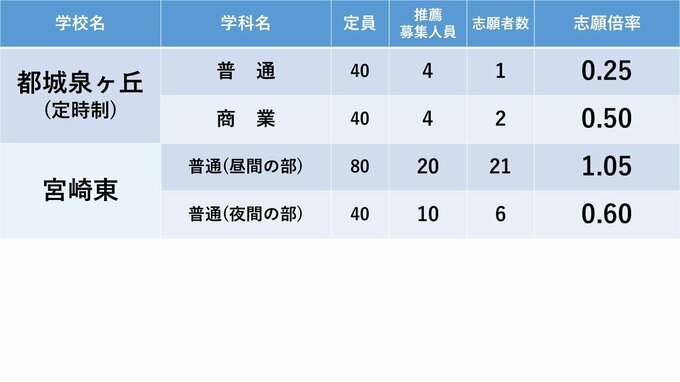 宮崎県立高校入試 2024年推薦入試(自己推薦方式)志願状況【全高校・学科】 全日制倍率「1.70倍」 2024年1月24日(水) 18:00 国内 暮らし・マネー 定時制各校の志願倍率 なお、一般入試は3月5日と6日に行われることになっています。