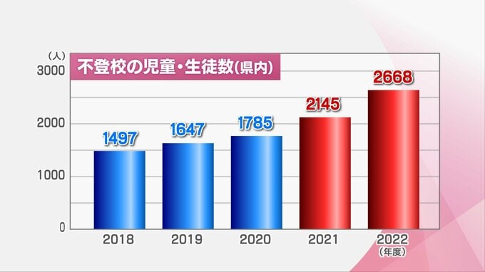 宮崎県内の過去5年間の不登校の児童・生徒数ですが、ご覧いただいて分かるように増加傾向にあって、特に、2021年度と2022年度は大幅に増えています。