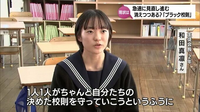 「(改定前は)守れてない人もやっぱりいて、ただ、今回、自分たちの意見で校則を変える、自分たちの意思で変えるということで、1人1人が『ちゃんと自分たちの決めた校則を守っていこう』というふうに意識を変えられたのではないかと思います」