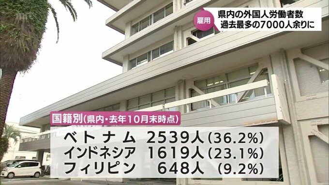 宮崎県内の外国人労働者は7021人で過去最高に 約6割が技能実習生 2024年1月30日(火) 19:00 国内 宮崎県内の外国人労働者の数は7000人余りで、過去最多になりました。このうち、およそ6割が技能実習生となっています。宮崎労働局によりますと、去年10月末時点の外国人労働者の数は7021人で、前の年を1405人、率…