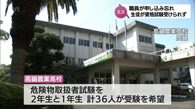 危険物取扱者の試験申し込みを学校職員が忘れる 高鍋農業高校の生徒36人が今月実施の試験を受験できず 2024年2月2日(金) 19:00 国内 宮崎県立高鍋農業高校で、36人の生徒が受験を希望していた国家資格の試験の申し込みを職員が忘れてしまい、生徒が今月の試験を受けられなくなったことが分かりました。県によりますと、高鍋農業高校では、今月11日…