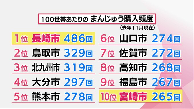 去年の11月までのまんじゅう購入頻度のランキングでの1位は長崎市で、宮崎市は10位となっています。