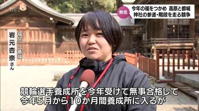 (福男・一番福 岩元杏奈さん)「競輪選手養成所を今年受けて無事合格して今年5月から10か月間養成所の方に入るけど、やはり福女ということで掴み取ることができてうれしい」