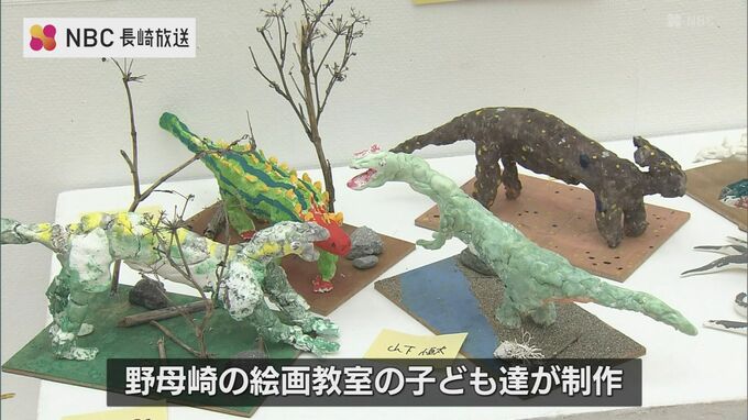 野母崎の絵画教室に通う子どもたちが制作したのは、恐竜の身体の構造を学んだ上で針金で骨格をつくり紙粘土で肉付けした作品。子どもたちの豊かな想像力が形になりました。