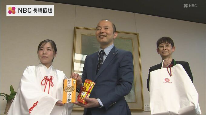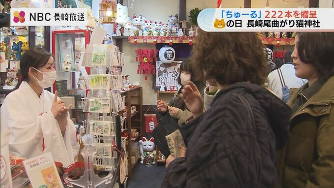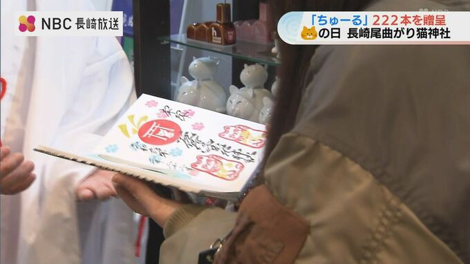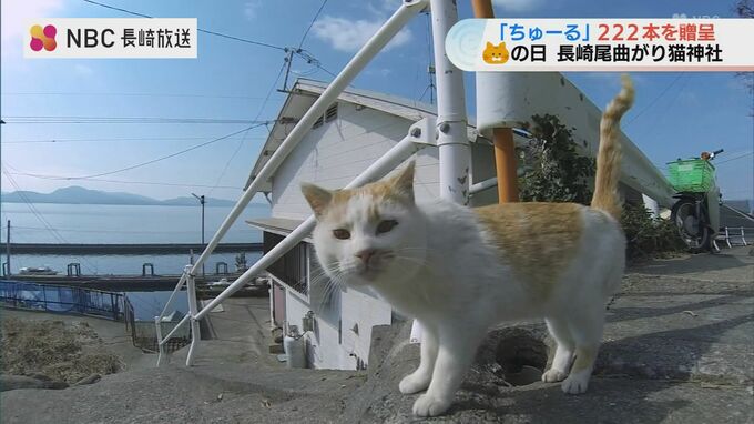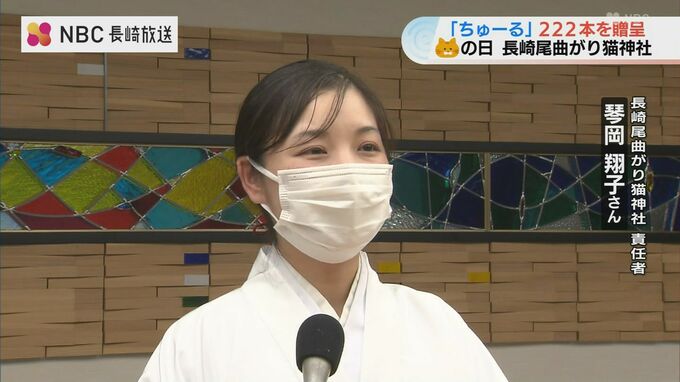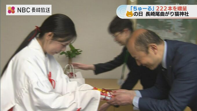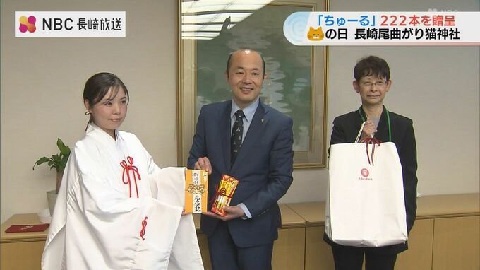 『猫の日』の22日は、神社の運営責任者らが、長崎市を訪れ、地域ネコ対策用に22万円と、長崎市動物愛護管理センターの保護ネコ用におやつ222個を寄贈しました。