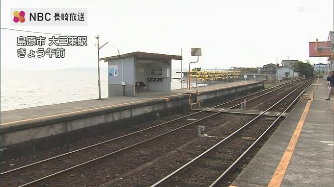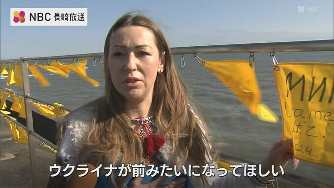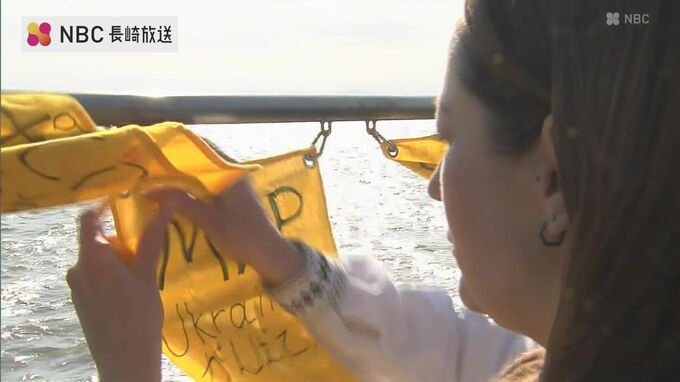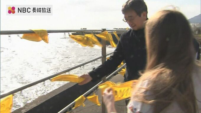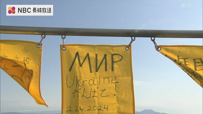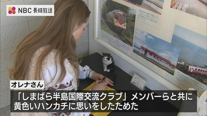幸せの黄色いハンカチで知られる長崎県の島原鉄道「大三東駅」に、ウクライナ人女性らが、平和の願いを書いたハンカチを掲げました。