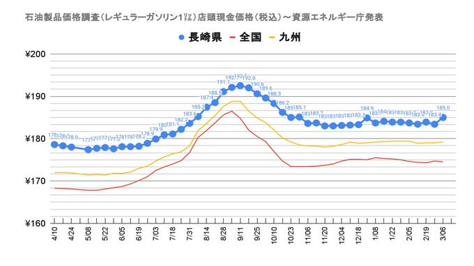 長崎県ではレギュラーガソリンが1リットルあたり185.0円で前回調査(2/26時点)から1.6円値下がりました。