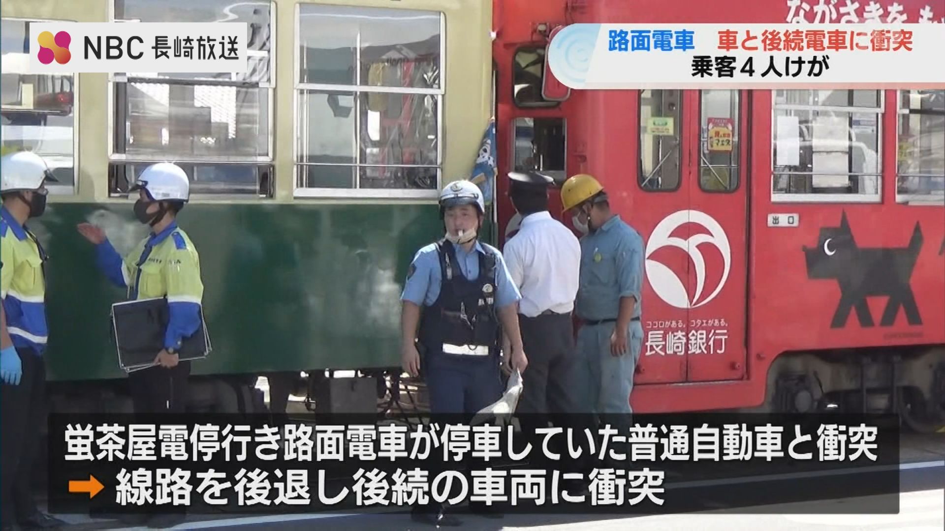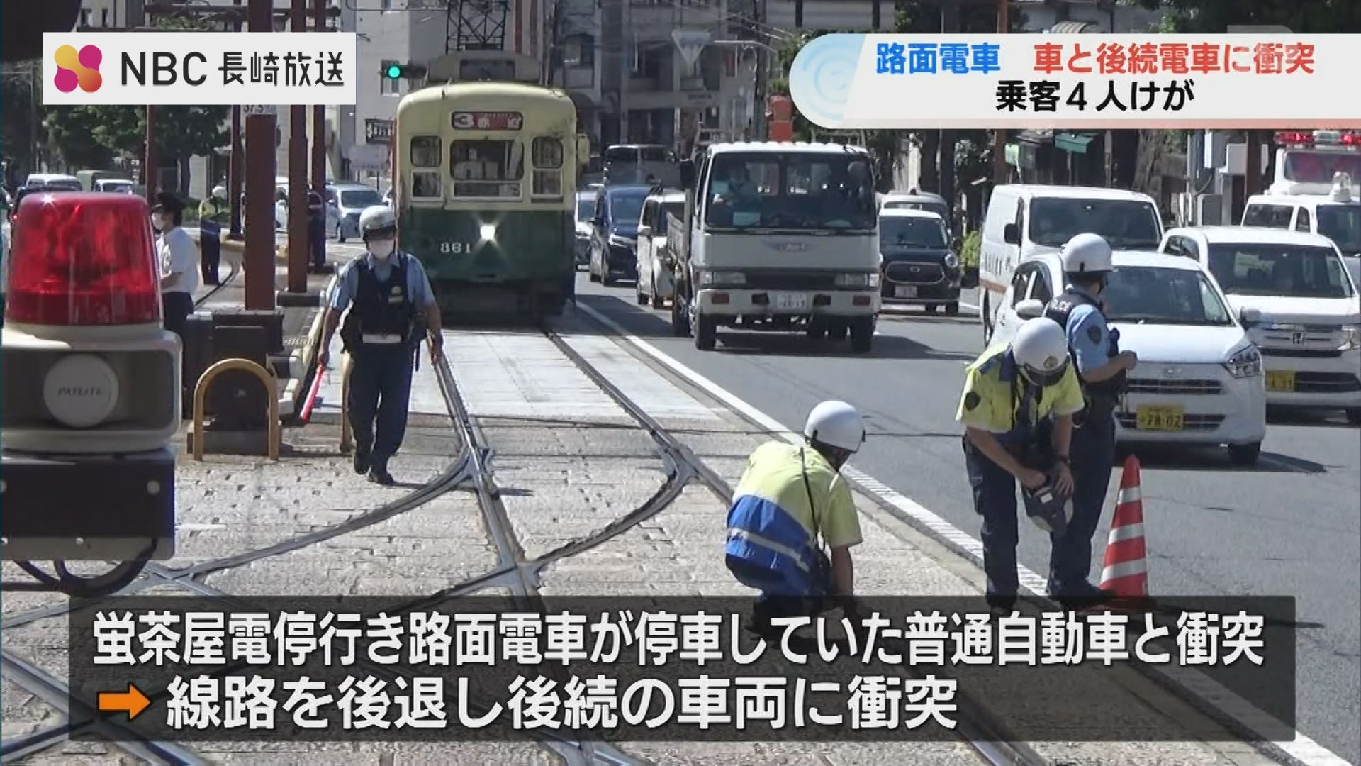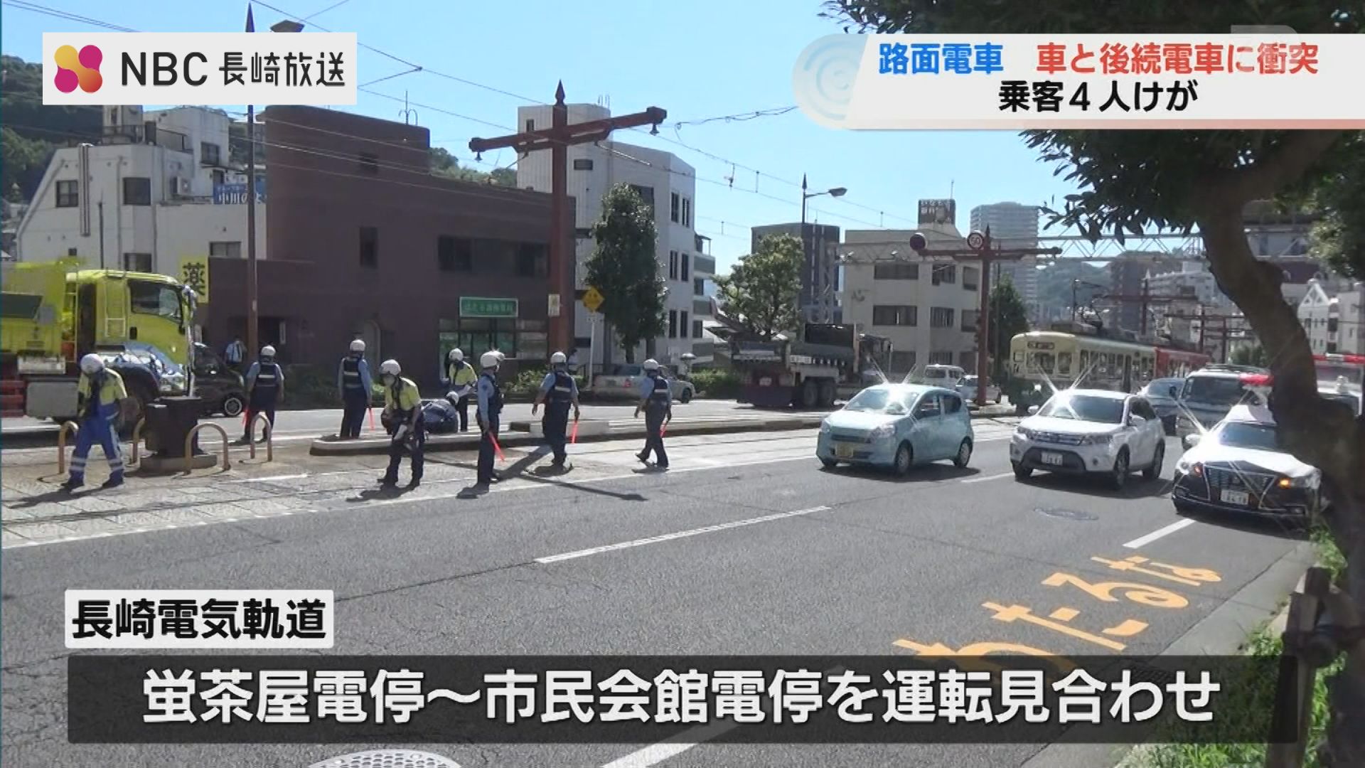 26日午後2時頃、長崎市の蛍茶屋電停付近で、路面電車が、車と後続の路面電車に衝突する二重事故があり、長崎電気軌道によりますと、乗客4人がケガをしました。