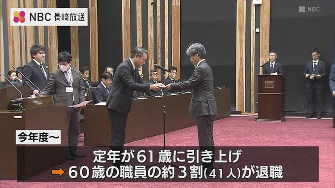 法改正により2023年度から定年が61歳に引き上げられ、29日は、60歳を迎えた職員のおよそ3割にあたる41人が退職を迎え、辞令交付式が行われました。