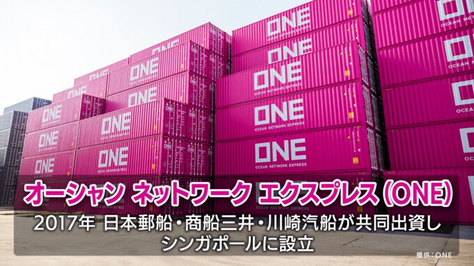 そのコンテナを扱う輸送会社に「オーシャン ネットワーク エクスプレス(ONE)」という会社がありますが、2017年に、日本郵船・商船三井・川崎汽船の3社が共同出資してシンガポールに設立された会社です。