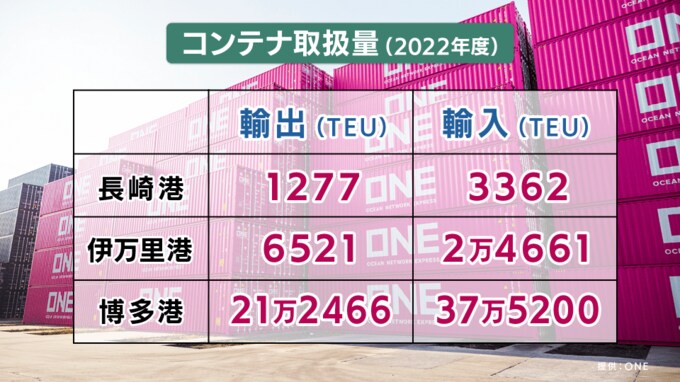 一方、佐賀県の伊万里港では、輸出6,521、輸入2万4,661、福岡県の博多港では、輸出21万2,466、輸入は37万5,200の取扱量があります。