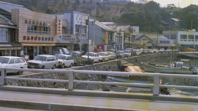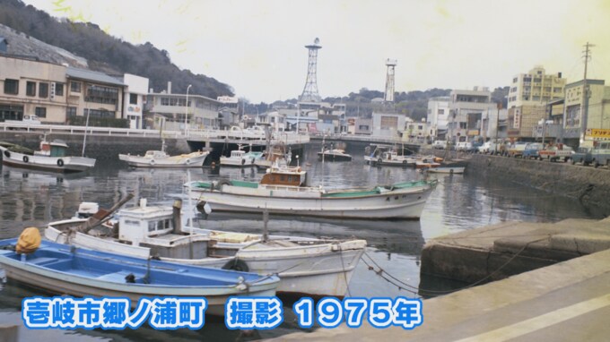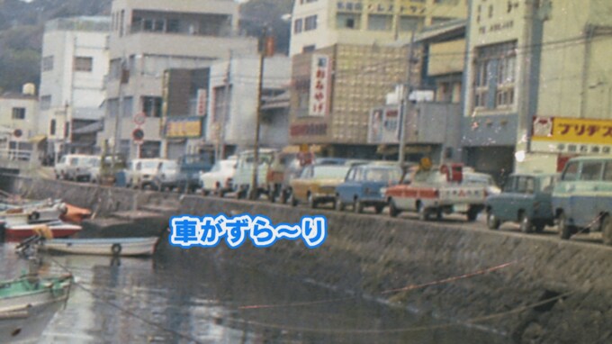 1975年、壱岐市郷ノ浦町で撮影された写真です。港の風景ですが、我々は写真の右側に写っている車の列に注目しました。