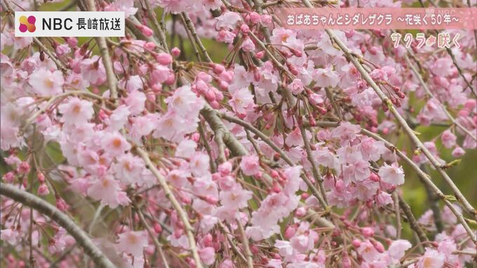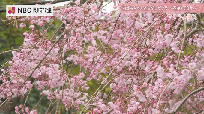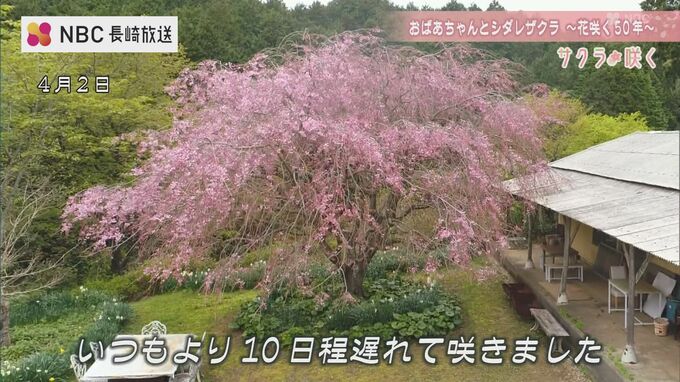 4月2日、樹齢50年の枝垂れ桜がいつもより10年ほど遅れて咲きました。