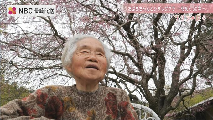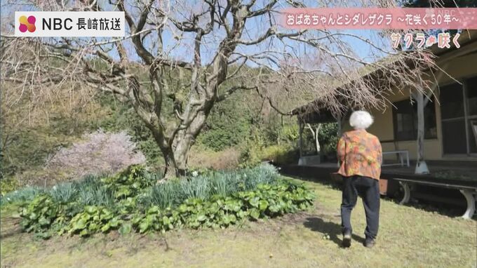 「いつもね、一番早く枝垂れ(しだれ)が咲くんですよ。だけどに今年は遅いね。もう年取ったんでしょう。私みたいに」