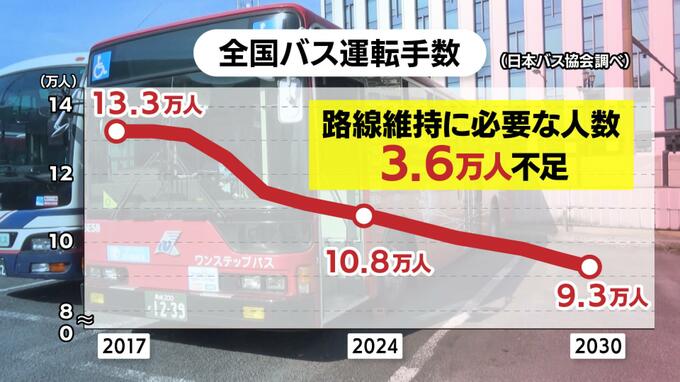 【平】バスの運転手不足も深刻なんです。全国のバス運転手数は、大幅に減っていて、2030年には路線の維持のための人数が《3.6万人不足する》と見込まれています。(日本バス協会調べ)