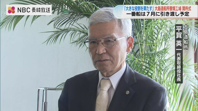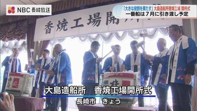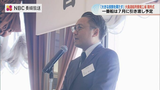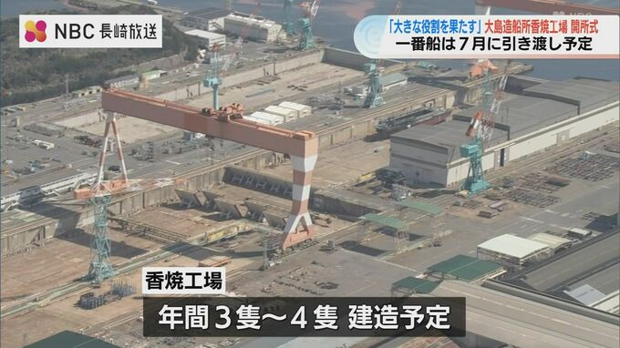 大島造船所がおととし、三菱重工から引き渡しを受けた香焼工場の開所式が23日行われました。1番船の引き渡しは7月に予定されています。