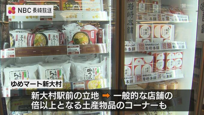 ゆめマート新大村は店舗面積が約2,190平方メートルで、県内産の野菜や生鮮食品をはじめ、新大村駅前の立地にちなみ、一般的な店舗の倍以上となる《地元の土産物品》を並べたコーナーが設けられています。