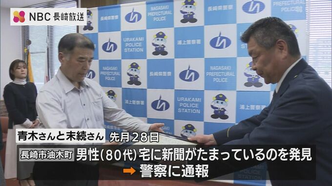 このうち、青木さんと末続さんは、先月28日、長崎市油木町の80代の男性の自宅で、郵便受けに4日分の新聞がたまっているのを見つけ、警察に通報。